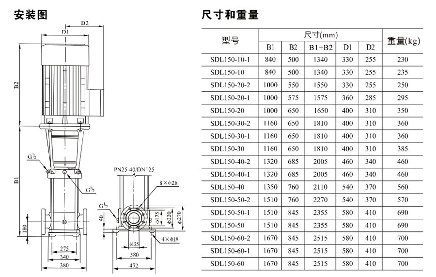 SDL150/SDLT150立式多級離心泵其管道式結(jié)構(gòu)可以確保泵可直接安裝在進(jìn)出在同一水平線上且管徑相同的水平管路系統(tǒng)中,這種設(shè)計使泵的結(jié)構(gòu)和管路更為緊湊。