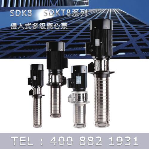 SDK8/SDKT8為配用標準電機的非自吸立式多級離心泵,電機軸和泵軸用聯軸器直接聯接的結構。為滿足水槽或容器的安裝深度,可安裝空套的腔體來改變泵本身的侵入 深度。